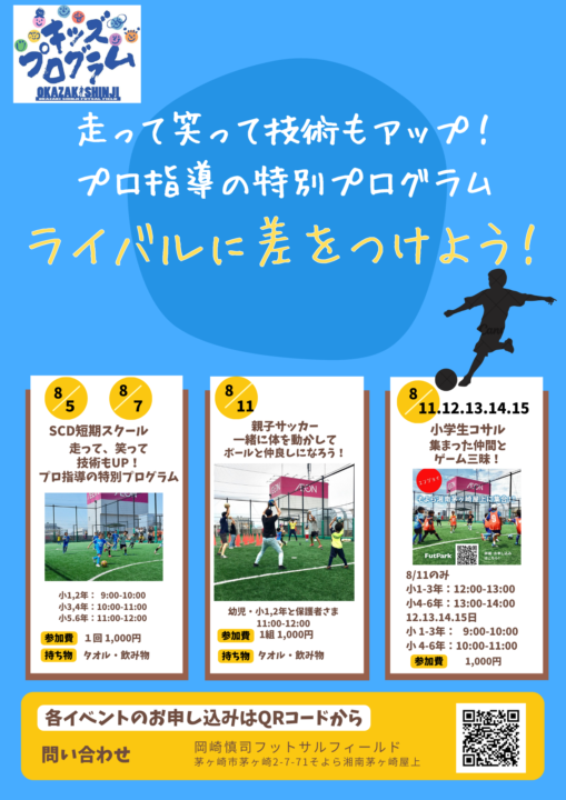 2025.07.13 お知らせ イベント・大会情報 個サル・クリニック情報 夏休み キッズプログラム キッズのみなさん〜 夏がきました〜 『たくさん走って、笑ってボールを蹴って技術をUP! プロ指導の特別プログラム ”ライバルに差をつけよう”』 プログラムが出揃いました どちらもベテランコーチ陣がお子様のサポートに入ります。 ・駐車券無料 ・そよら内ウェンディーズのお得なクーポン付き ご家族はそよら湘南茅ヶ崎内でお買い物も楽しめます。 スタッフ一同待ってます!! お申し込みはこちらから(無料登録) コサル スクール・親子 7月20日(日) 岡崎慎司フットサルフィールド U8-2年生以下の大会 大人もゲーム三昧!大人のエンジョイコサル⚽️ ツイート